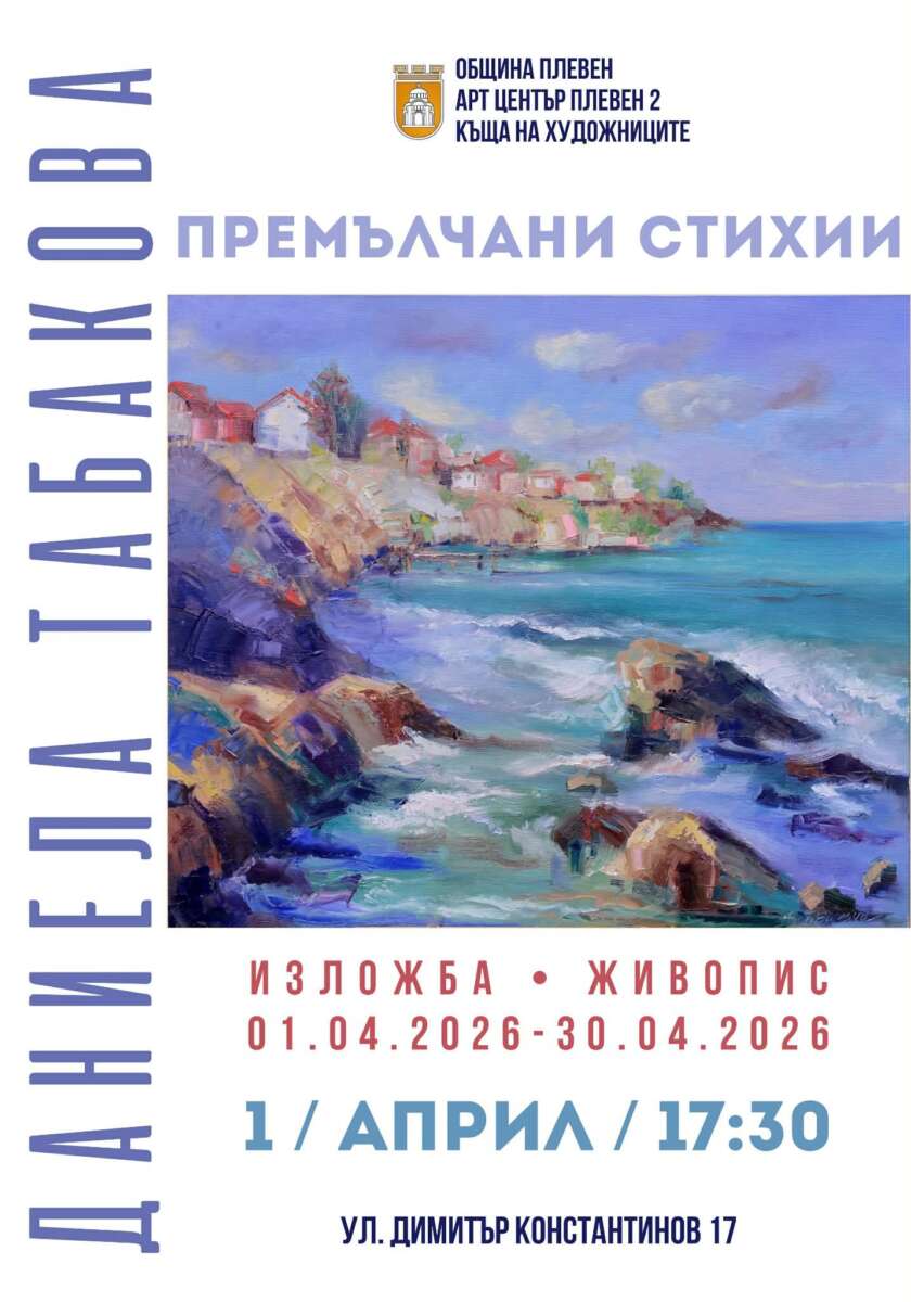 Даниела Табакова ще открие първата си самостоятелна изложба живопис “Премълчани стихии” в Плевен. Датата е 1 април 2026 г., мястото – Къщата на художниците (ул. “Димитър Константинов” 17), а моментът на срещата с публиката е 17,30 ч.