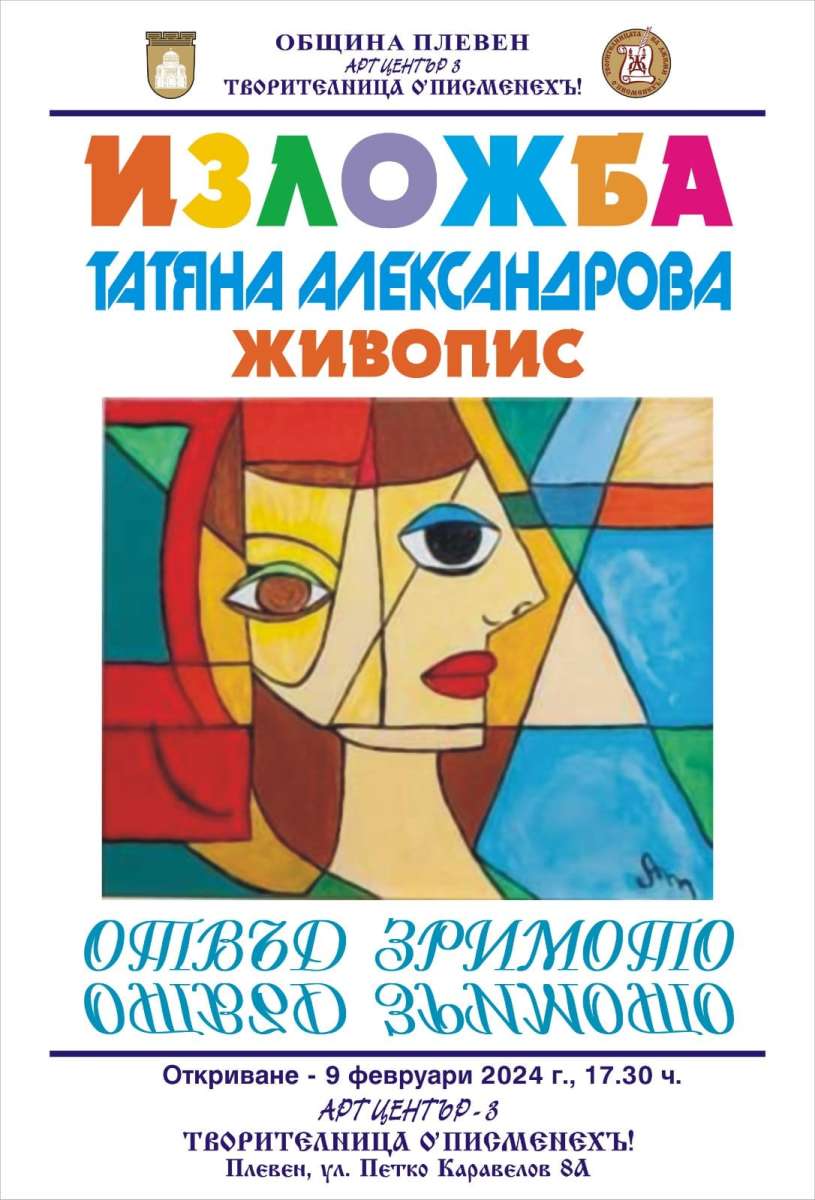 Изложба живопис “Отвъд зримото” ще подреди Татяна Александрова в Творителница “О’Писменехъ!” (ул. “Петко Каравелов” 8а) в Плевен. Експозицията ще бъде открита на 9 февруари 2024 г., в 17.30 ч.,