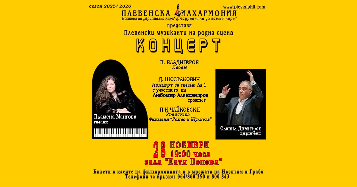 28 ноември – Концерт на Плевенската филхармония със солист Пламена Мангова – пиано, диригент: Славил Димитров, в програмата: П. Владигеров – Песен, Д. Шостакович – Концерт за пиано № 1; П. Й. Чайковски – Увертюра-фантазия “Ромео и Жулиета”, с участието на Любомир Александров – тромпет – в зала “Катя Попова”, 19 ч.