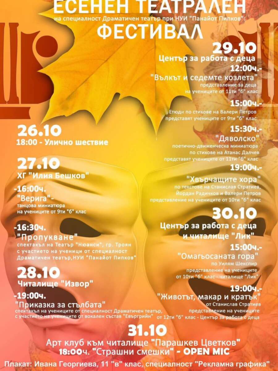На 29 октомври, в Центъра за работа с деца ще се състоят 4 представления. В 12 ч. започва спектакълът за деца “Вълкът и седемте козлета” – с участието на учениците от 11-ти “б” клас. В 15:00 ч. ще бъдат представени етюди по стихове на Валери Петров от учениците от 9-ти “б” клас.