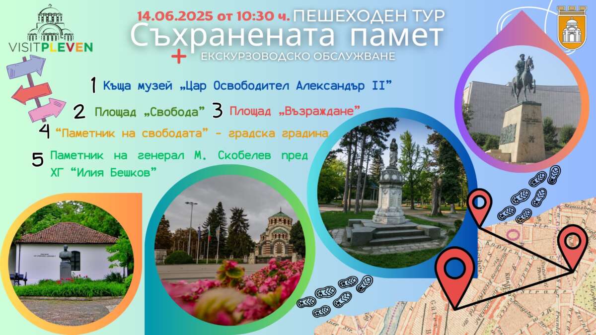 Пешеходният тур „Съхранената памет“ ще представи част от историческите забележителности на Плевен. Той ще се проведе тази събота, 14 юни 2025 г., от 10:30 часа. Водач ще е историкът д-р Галин Димитров. Всеки, който проявява интерес към историята на Плевен, е поканен да се включи в инициативата.