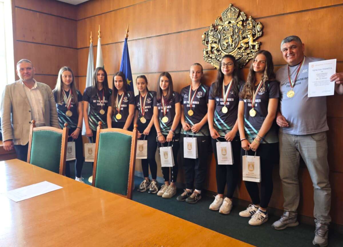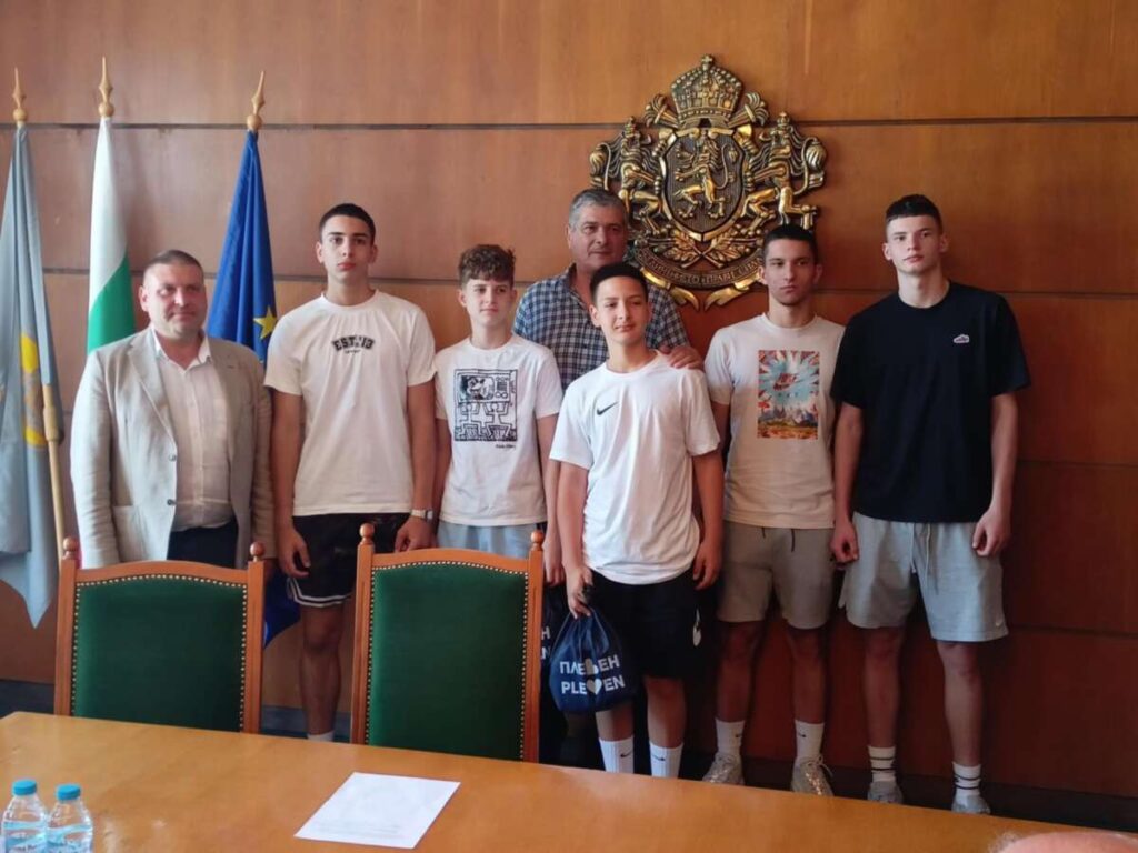 Баскетболният отбор на Профилираната гимназията с преподаване на чужди езици „Димитър Димов” с преподавател Пламен Нанков и отборът по лека атлетика за девойки на Математическата гимназия „Гео Милев“ с преподавател Мариян Георгиев бяха отличени днес с почетни грамоти от Община Плевен, придружени и с подаръци от местната управа – спортни артикули. И двата отбора станаха държавни шампиони за възраст 8 – 10 клас на Ученическите игри за 2024/2025 учебна година и спечелиха два златни медала за Плевен. Наградите на младите спортисти на Плевен и техните преподаватели връчи кметът на Общината д-р Валентин Христов по време на редовното оперативно заседание на общинско ръководство, което се провежда в присъствието и на медиите.
