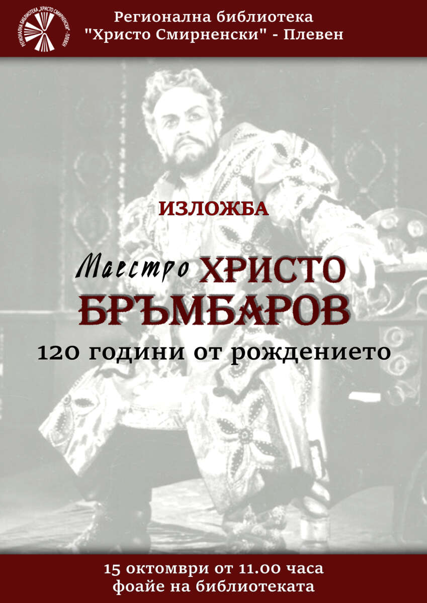 Регионална библиотека „Христо Смирненски” – Плевен ще открие изложба по повод 120 години от рождението на великия оперен певец и педагог Христо Бръмбаров. Събитието ще е на 15 октомври 2025 г. (сряда), от 11:00 ч., във фоайето на библиотеката.