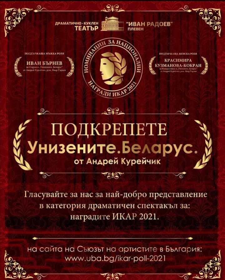 Спектакълът “Унизените. Беларус” на Драматично-куклен театър “Иван Радоев” – Плевен е номиниран за награда “Икар” 2021 г. в категория “Най-добър драматичен спектакъл”. Желаещите да го подкрепят могат да гласуват тук: https://uba.bg/ikar-poll-2021/