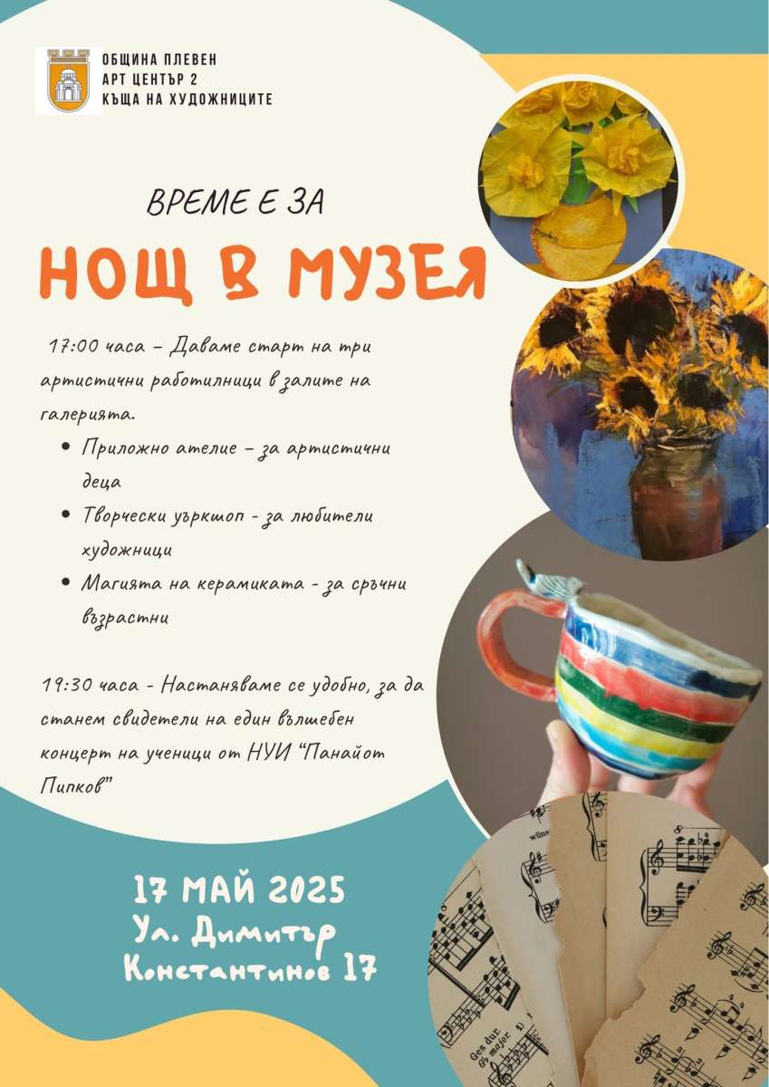 Три творчески работилници и концерт на ученици от Националното училище по изкуствата “Панайот Пипков” – Плевен, ще предложи Къщата на художниците (ул. “Димитър Константинов” 17, Плевен) в Европейската нощта на музеите и галериите – 17 май.