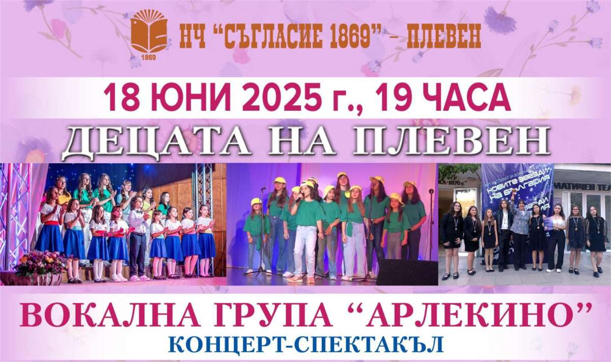 Вокална група „Арлекино“ с ръководител Виолета Боянова ще се представи с концерта „Децата на Плевен“ пред многобройните си почитатели. Най-младата творческа формация при читалище “Съгласие 1869” – Плевен, ще очаква с радостно вълнение зрителите днес, 18 юни, от 19 ч., пред входа на читалището.